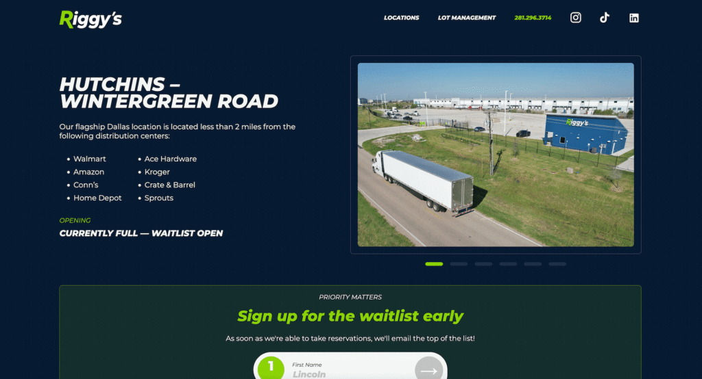 Riggy’s Wintergreen is a Hutchins area truck parking site that Riggy’s lists as its flagship Dallas location, and it often operates with limited availability and a waitlist.